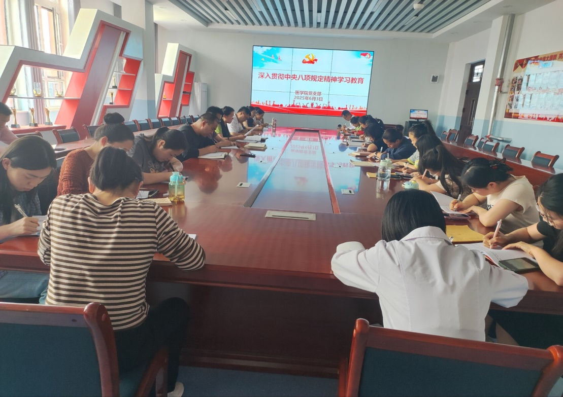 为进一步加强党的作风建设,巩固深化党纪学习教育成果、推进全面从严治党向纵深发展,6月3日下午,医学院开展深入贯彻中央八项规定精神学习教育,会议由医学院党支部书记、院长范玉敏主持,医学院全体教职工参加。