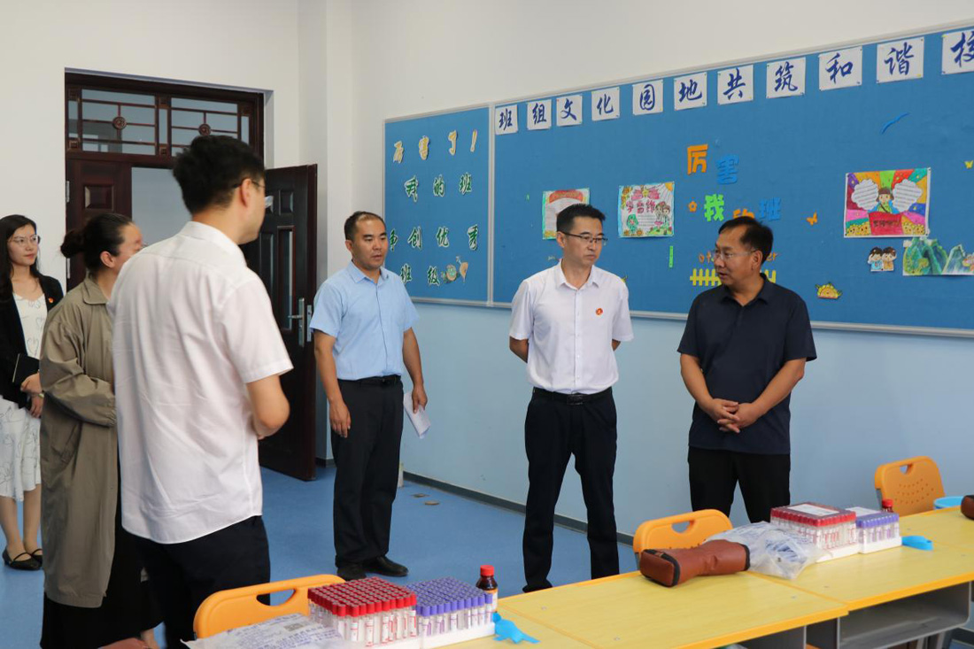 施荣同志深入体检区域,逐一查看了内科、外科、视力、血压、静脉采血、检验等各功能体检区,仔细询问了场地布置、设备调试、流程安排、人员配备及应急处理预案等关键环节的落实情况。医学院院长范玉敏就整体筹备工作作了系统汇报。